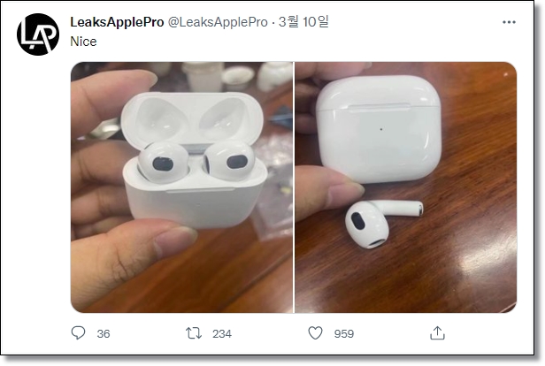 그동안 에어팟 3세대의 이미지는 많은 경로를 통해 유출이 되었다. 아래 사진은 지난 3월에 LeaksApplePro의 트위터에 게시된 것이다.