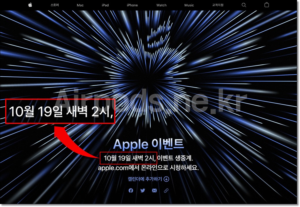애플은 공식 홈페이지를 통해서 10월 19일(화) 새벽 2시에 애플 이벤트를 공개할 것이라 밝혔다.(북미 기준 10월 18일 오전 10시)